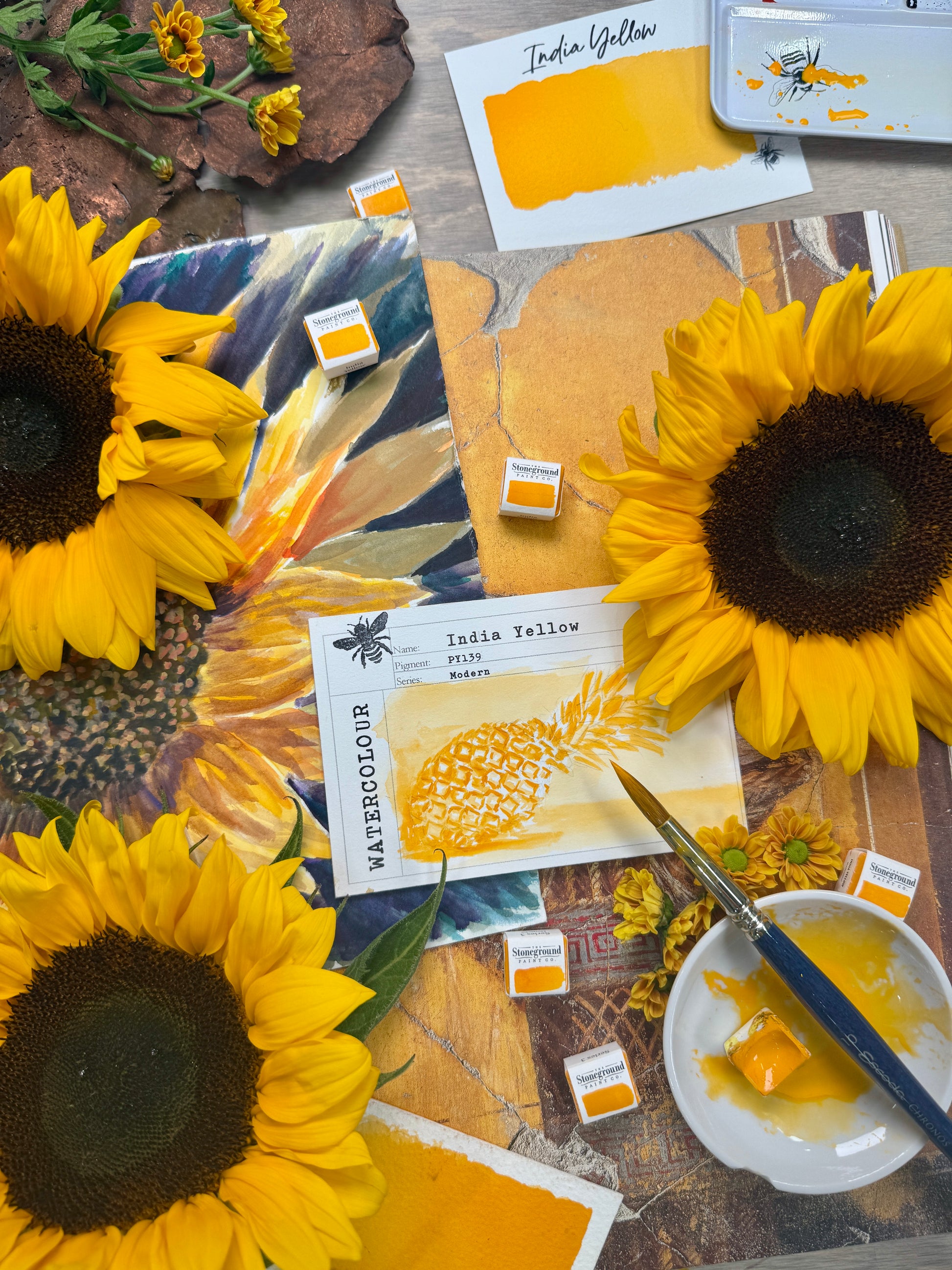 Artist Notes: This is a clean and vibrant colour almost on the verge of orange. Combine India Yellow with Pyrrole Red for vivid scarlets, or combine with Burnt Sienna Crimson for earthy desert colours.