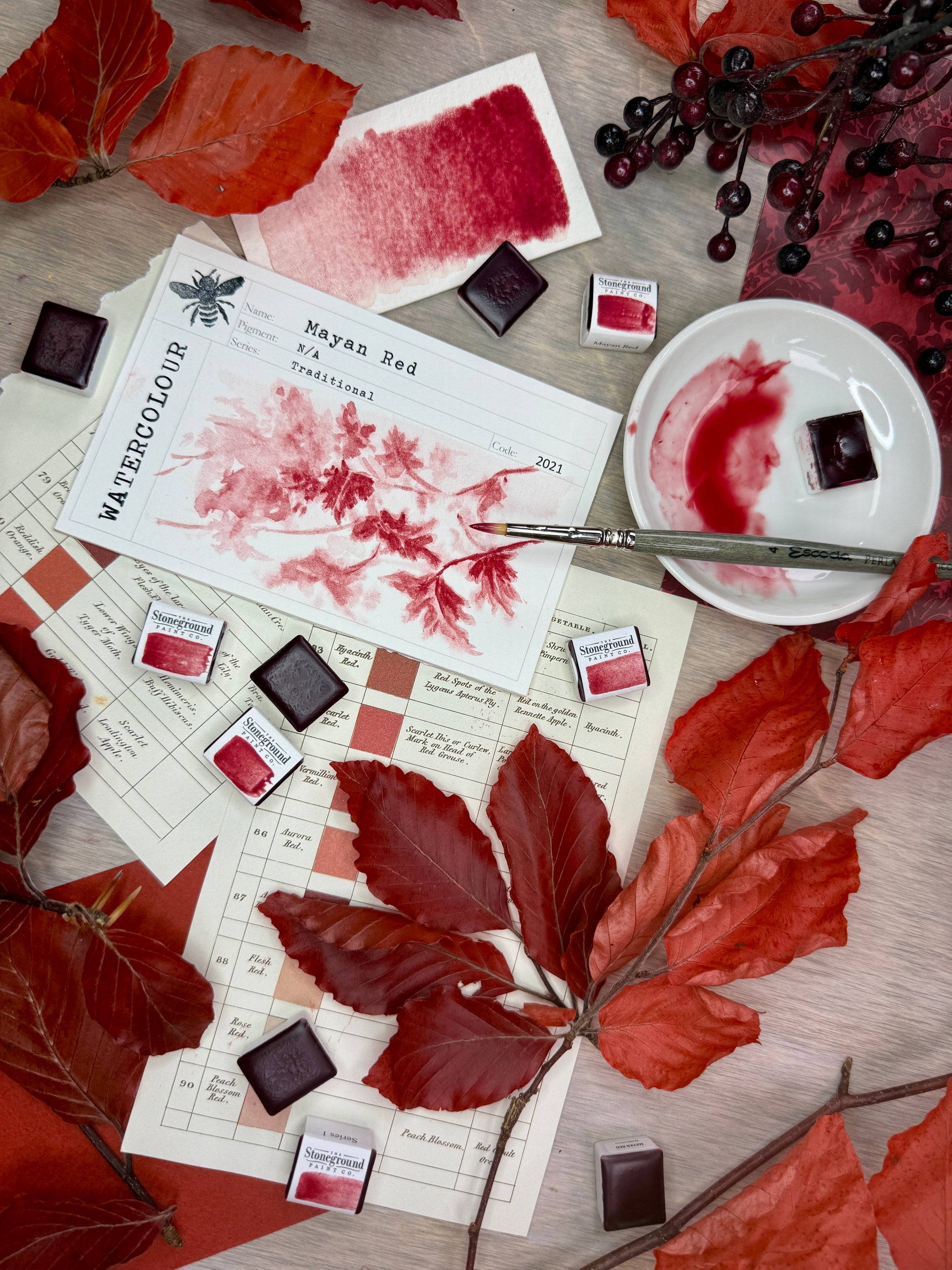 Artist Notes: Mayan Red is very useful in botanicals when combined with Quinacridone Magenta or Pozzuoli Earth Red, which result in vibrant reds and oranges with loads of depth and complexity. Mayan Red creates dark and moody browns when combined with Roman Black or Mayan Indigo Blue. Combine Mayan Red with Titanium Buff for an interesting muted rose red.
