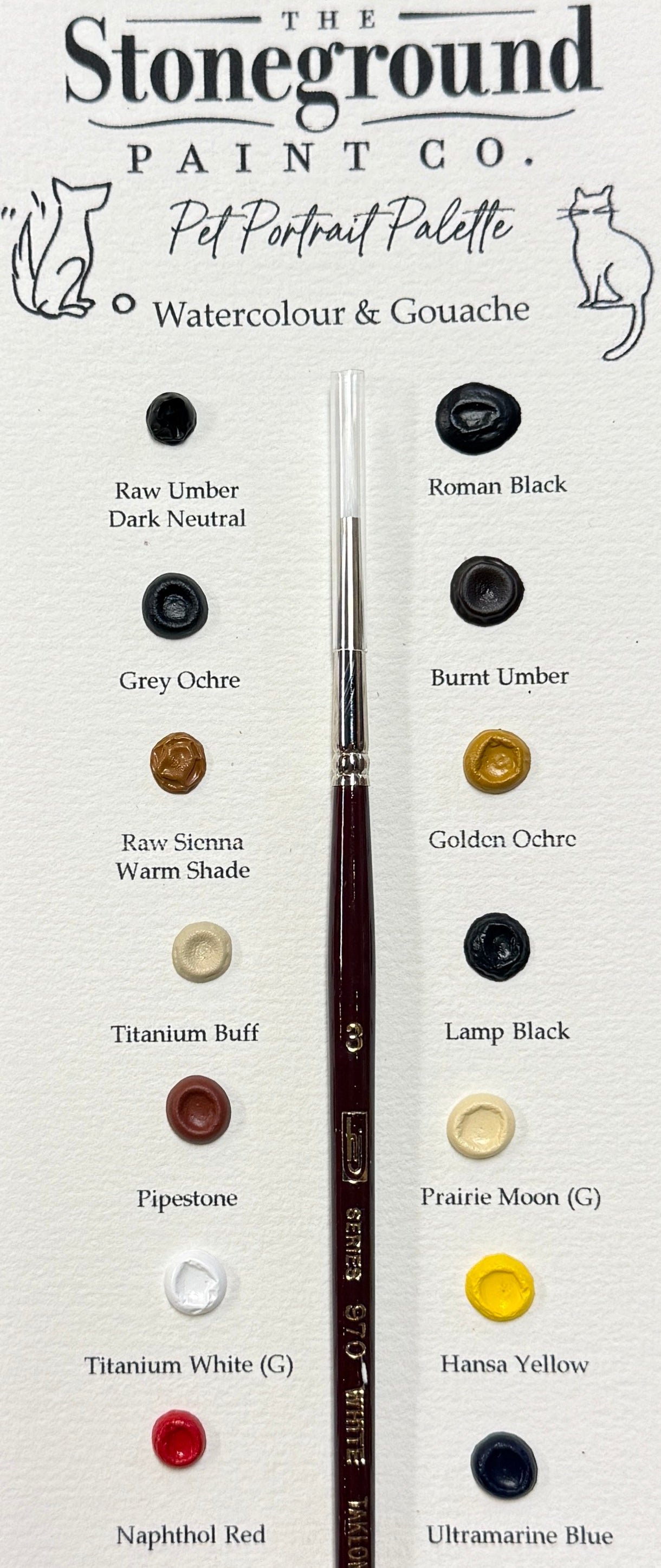 Our Pet Portrait Dot Card features 12 dots of watercolour and 2 dots of pigment rich gouache in the following colours;